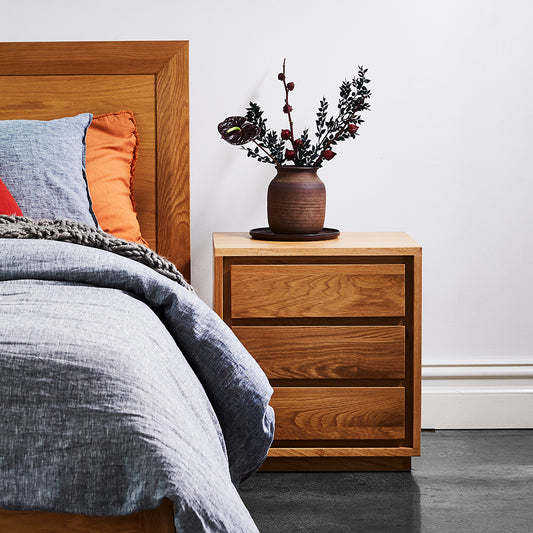 Our range of sustainable oak and walnut solid timber bedroom furniture includes bed frames that come in a range of single, double, king single, queen and king sizes, chest of drawers, bed heads and bedside tables available online or in our Melbourne & Sydney shops; with home delivery Australia wide.