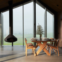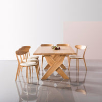 The Axel rectangular dining table in solid American oak features a bold, angular base and a robust tabletop for a confident dining statement. Crisp geometry meets everyday durability for families that live and entertain around the table. The 79″ x 43″ sizing offers generous surface area while keeping proportions balanced for modern spaces. Built from sustainably sourced timber with no MDF and no veneer to honor authentic materiality.
