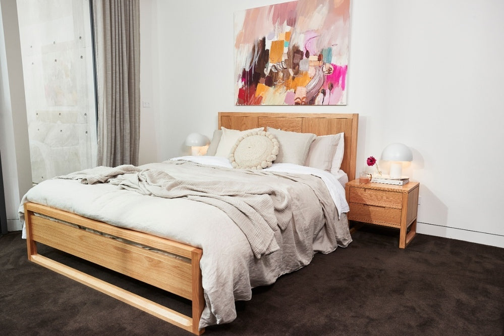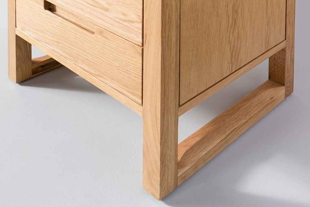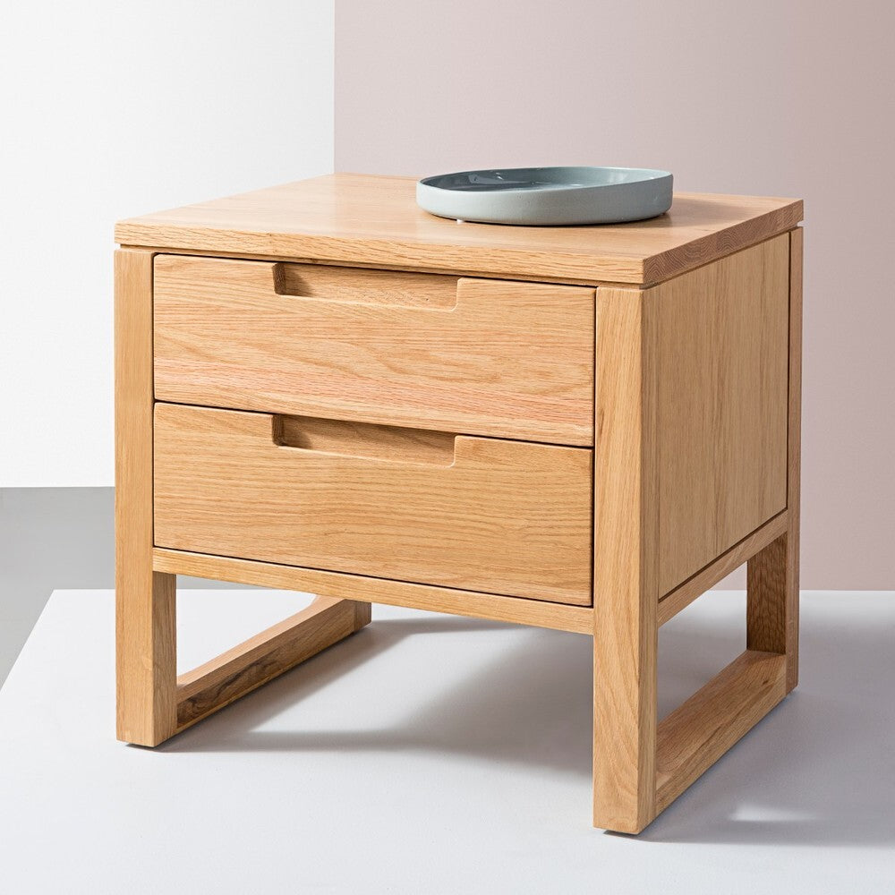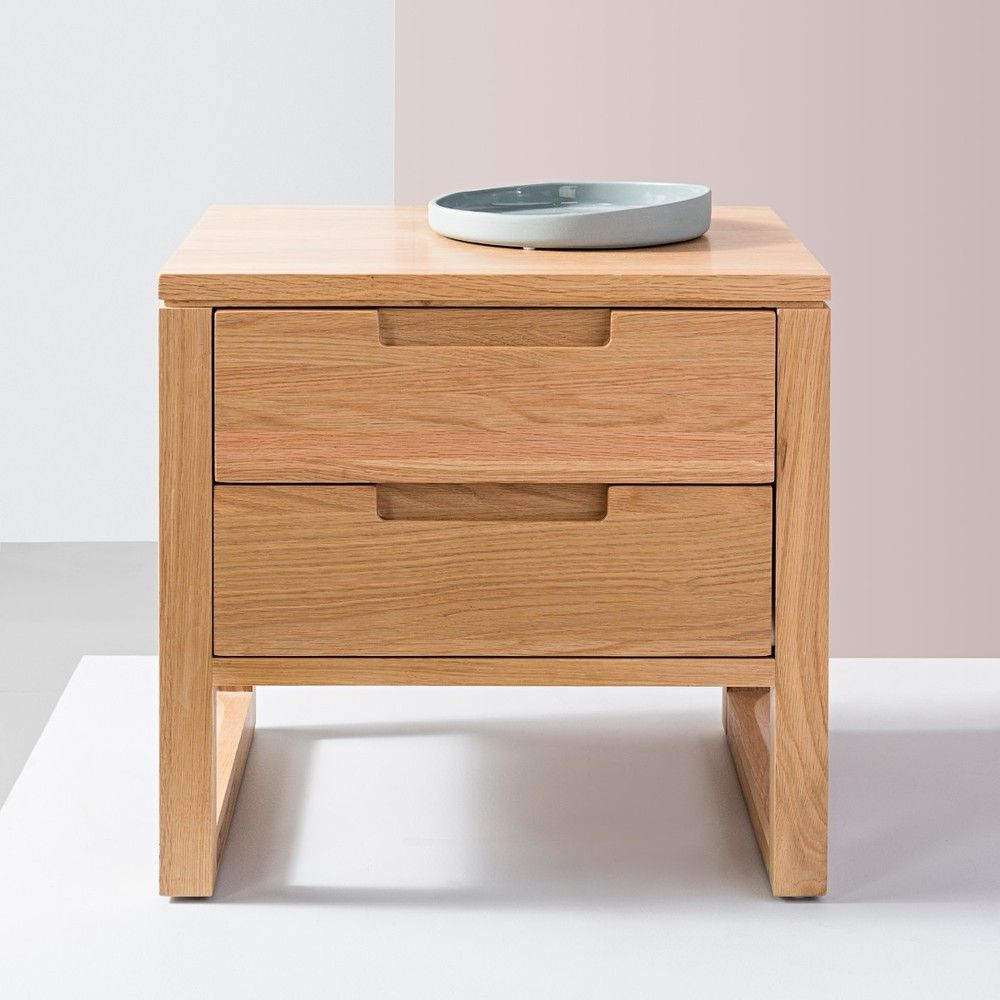 The Bruno nightstand in solid American oak brings compact order with 2 soft close drawers. Clean lines and a structured profile keep the bedside uncluttered, and the protective finish supports daily use.