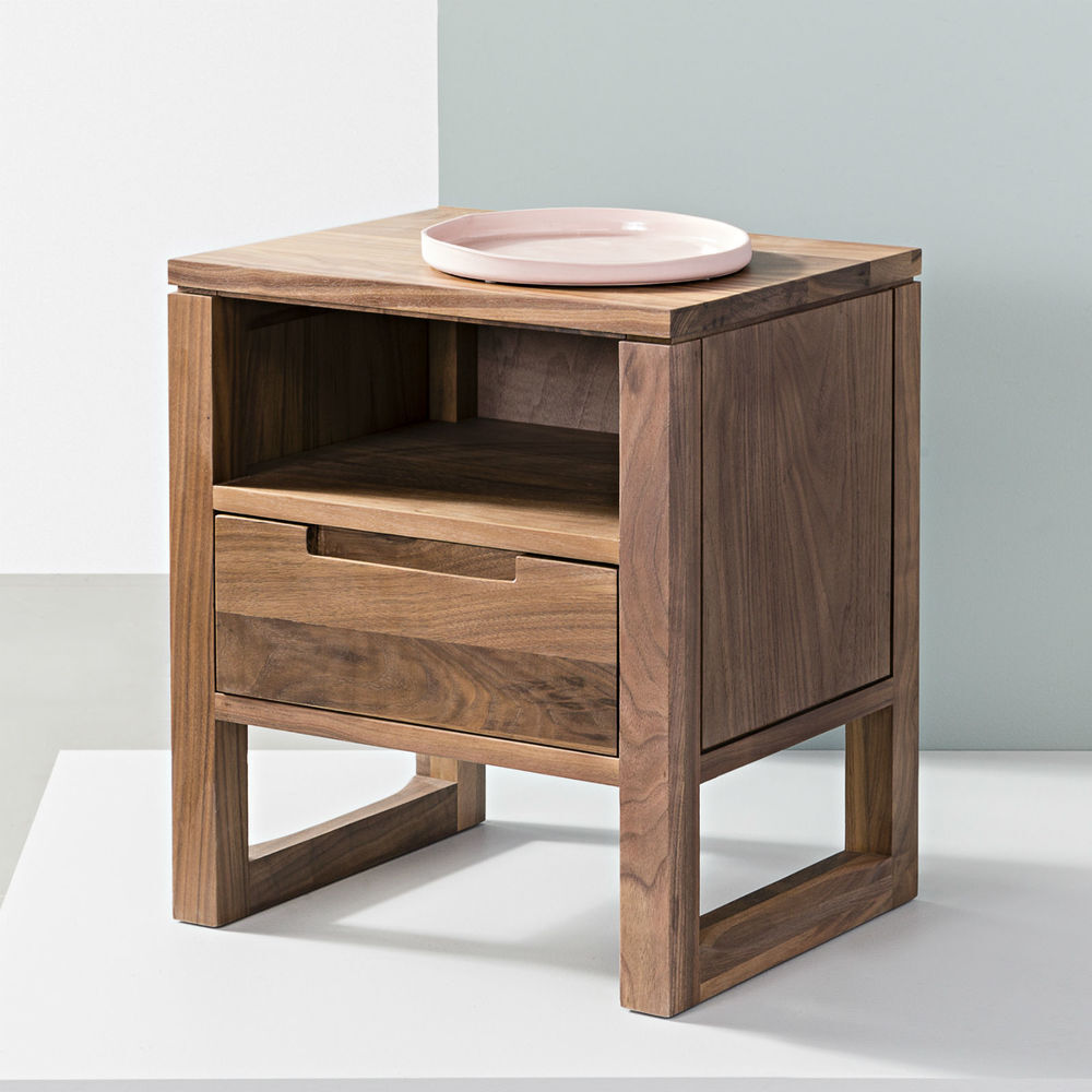 Our popular Bruno solid walnut bedside table features a bold square design that will add sophistication to any bedroom whilst keeping everything you need close at hand. The Bruno bedside table is available in one or two drawer options you'll want to talk about. A bevelled lip on each drawer front allows you to to open and close it with ease and adds to the minimalist look. The rich tones of solid walnut shine through thanks to its uncomplicated contemporary design. The Bruno bedside table pairs effortlessly with the Bruno bed frame or base and Bruno chest of drawers for a cohesive look.