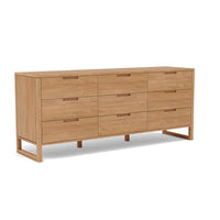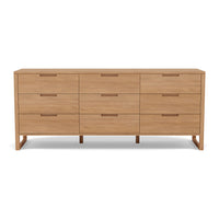 The Bruno dresser in solid American oak delivers structured minimalism with 9 soft close drawers for smooth, quiet storage. Clean lines and a composed silhouette anchor the room, while a felt lined top drawer protects delicate pieces. Built for longevity with a durable finish and authentic materiality.