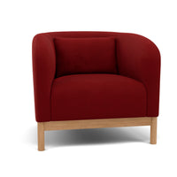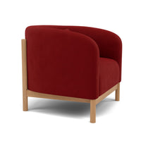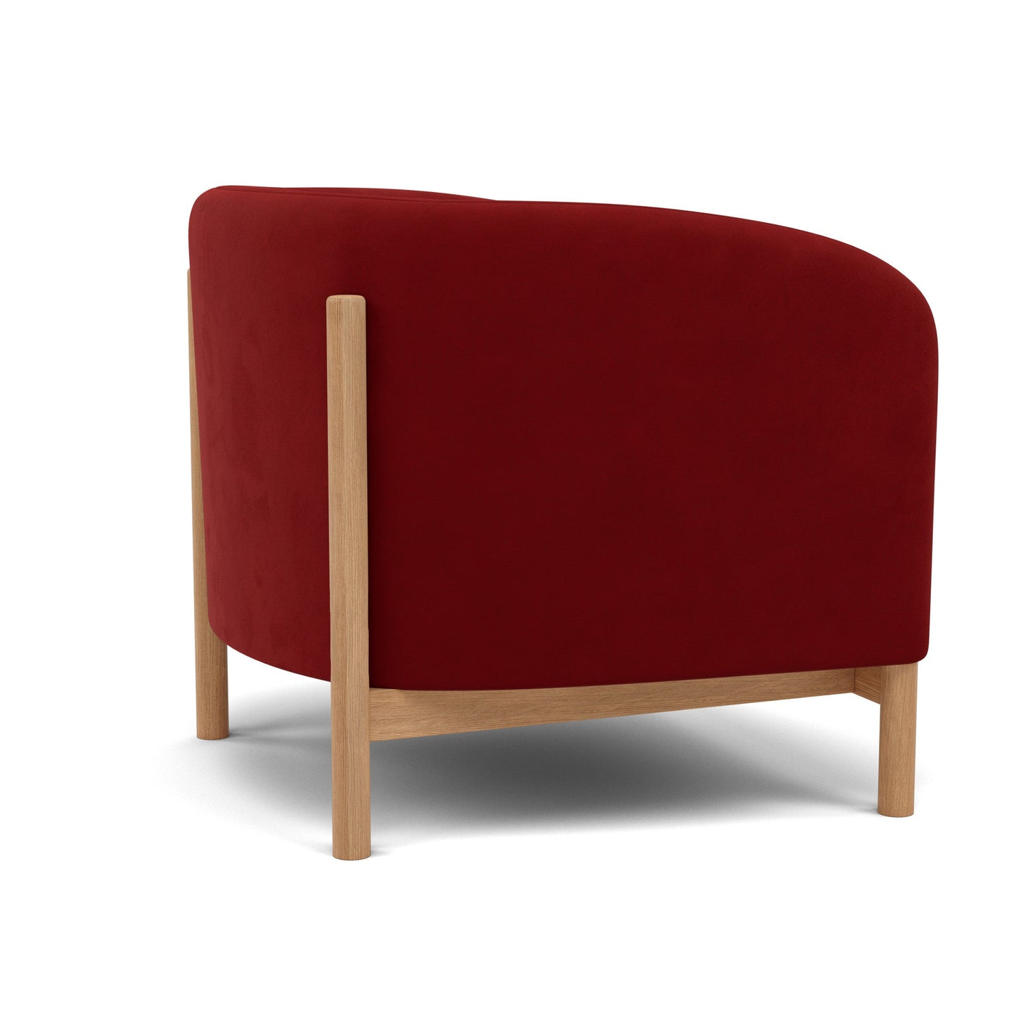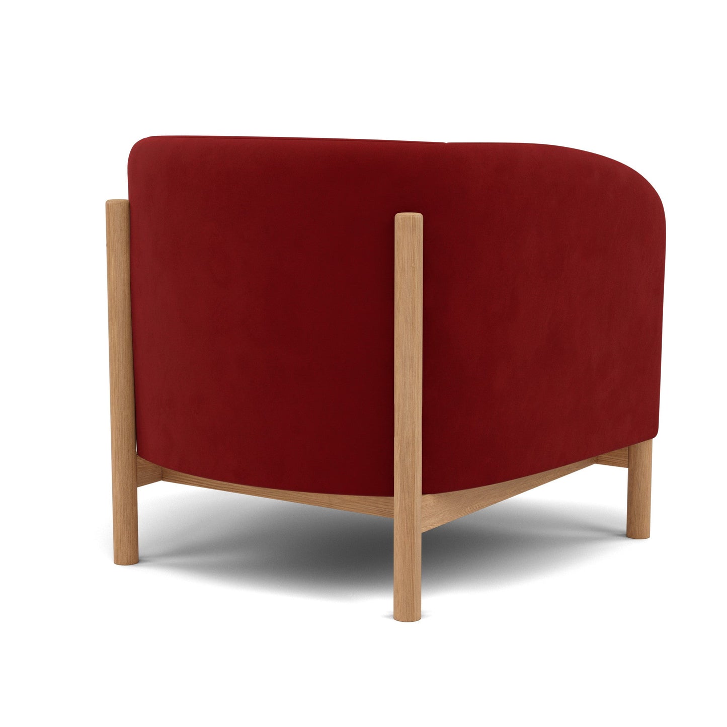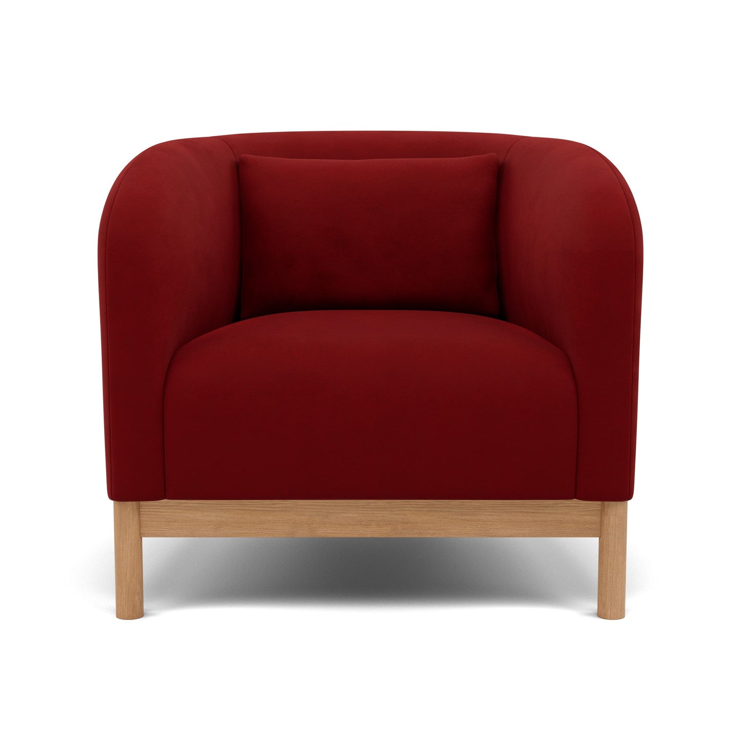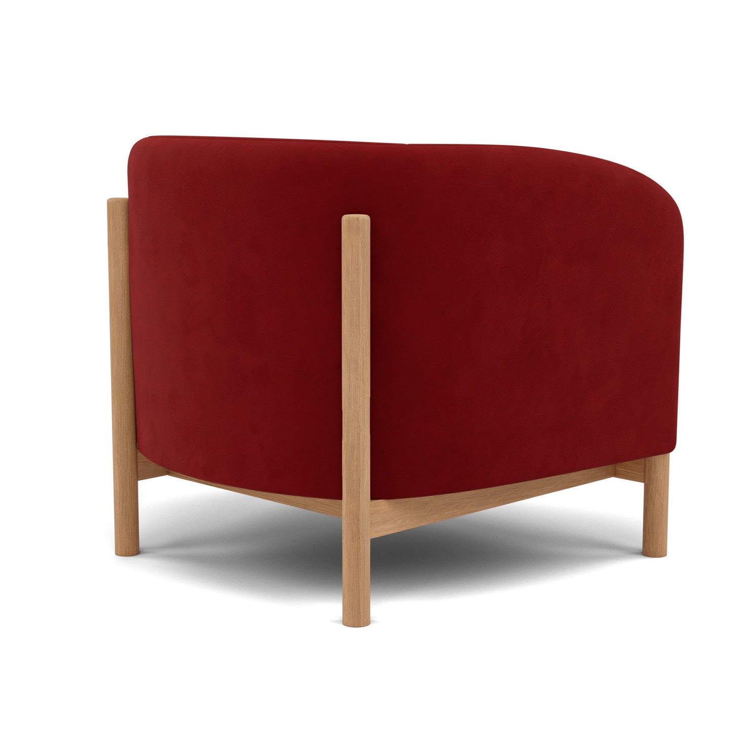 The Hink armchair in rich red velvet sits on a solid American oak base with rounded legs, delivering a Scandinavian inspired silhouette that feels both sculptural and welcoming. Its gently curved, barrel like back and cushioned arms create an embracing seat for reading, conversation, and quiet moments. The plush red velvet adds a vivid, confident note that feels luxurious yet warm. Hand finished timber highlights natural grain and craftsmanship, and construction is free from MDF and veneer for lasting integrity. An IconByDesign original, Hink balances statement making design with everyday comfort.