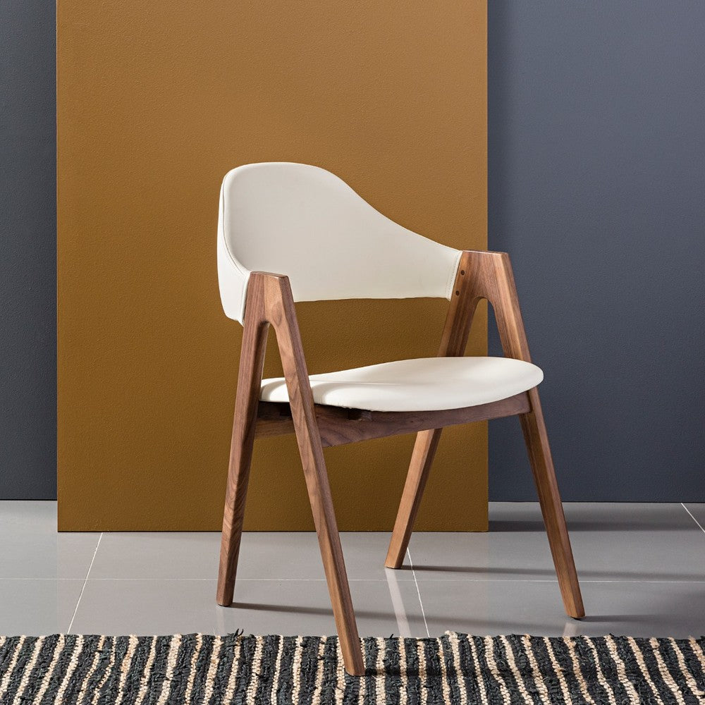 The Nestor Dining Chair is mid-century modern inspired and crafted from solid American walnut, designed to bring beauty and comfort to your table. Its frame is carefully joined for long term stability, while a supportive seat upholstered in cream leather encourages lingering conversations and relaxed meals. The leather is supple and designed to age beautifully with use. Subtle contours in the back and seat support natural posture so guests feel comfortable from first course to last. Hand finished surfaces celebrate the character of real wood and pair easily with modern or classic settings. Nestor’s sculpted backrest encourages an easy, upright posture through long meals. As an IconByDesign original, it reflects our commitment to enduring craftsmanship and design integrity that stands apart from imitations.