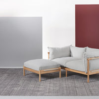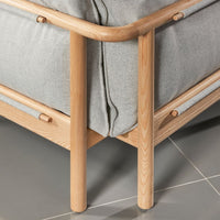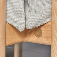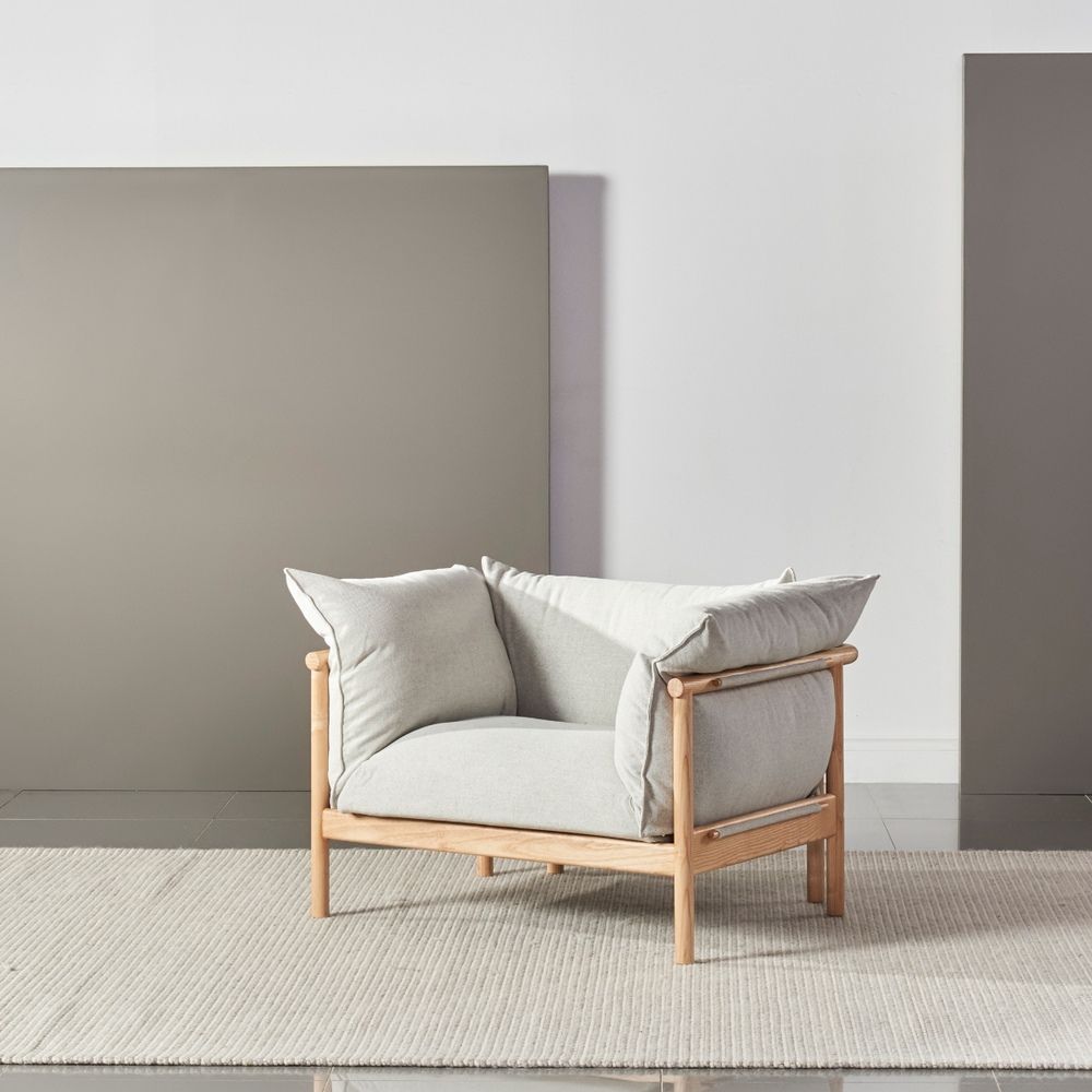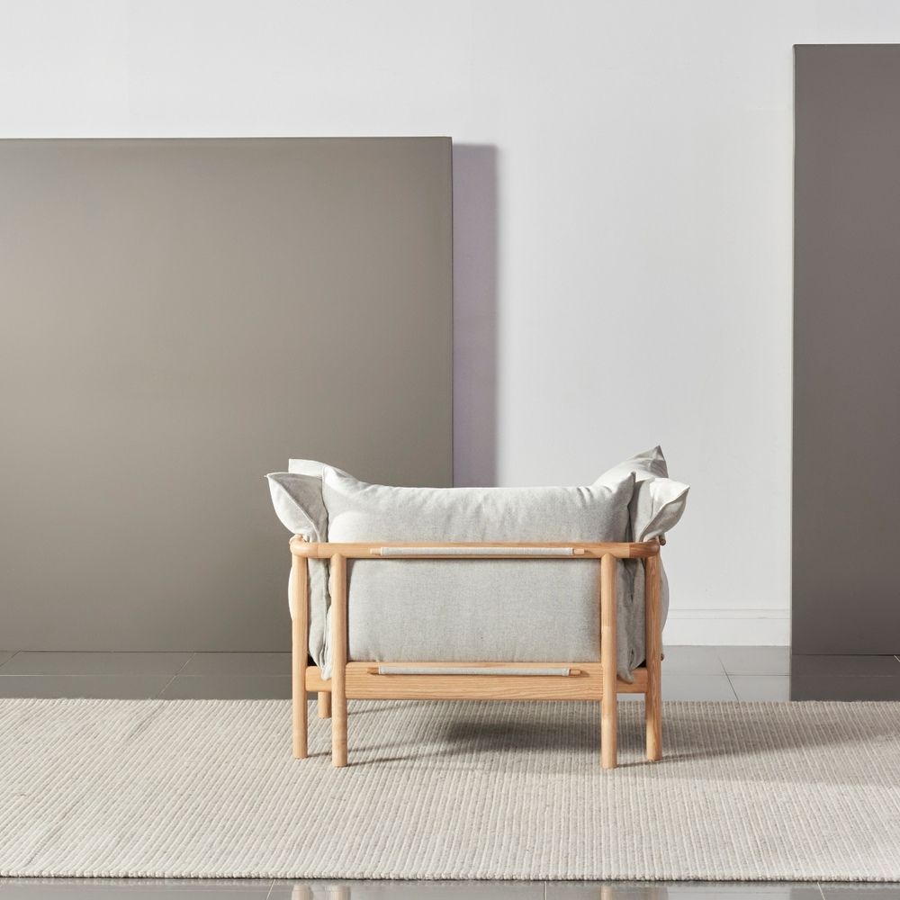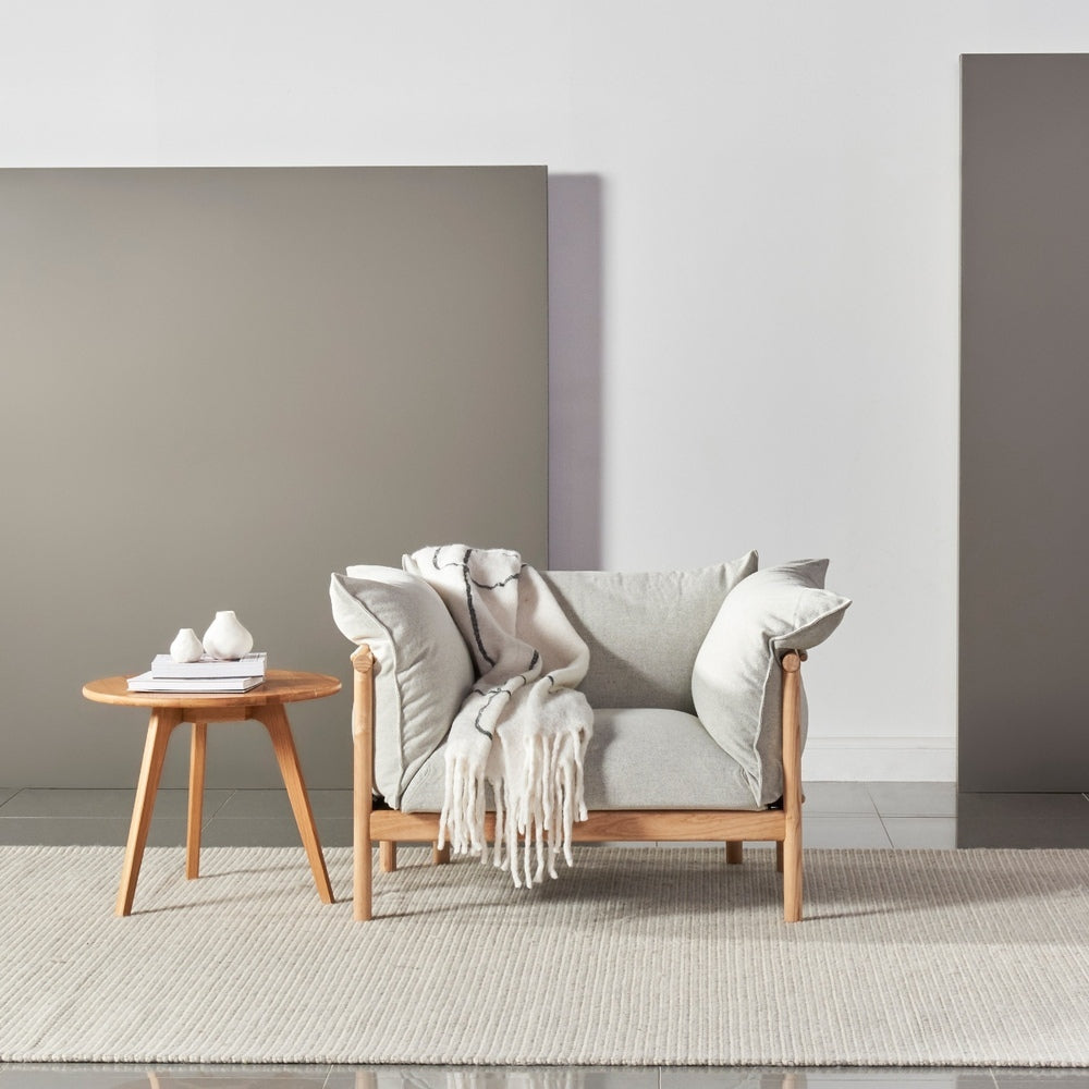 This Olivia armchair in soft grey fabric showcases Scandinavian inspired design elevated by a solid American oak frame. The tactile upholstery enriches the room while plush cushioning delivers a welcoming, sink in feel for reading, conversation, or quiet moments. Hand finished timber highlights natural grain and craftsmanship, creating a piece that looks beautiful from every angle. Olivia’s graceful silhouette and cylindrical legs feel light from every angle. An IconByDesign original crafted without MDF or veneer, it balances durability, comfort, and refined style for everyday living.