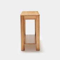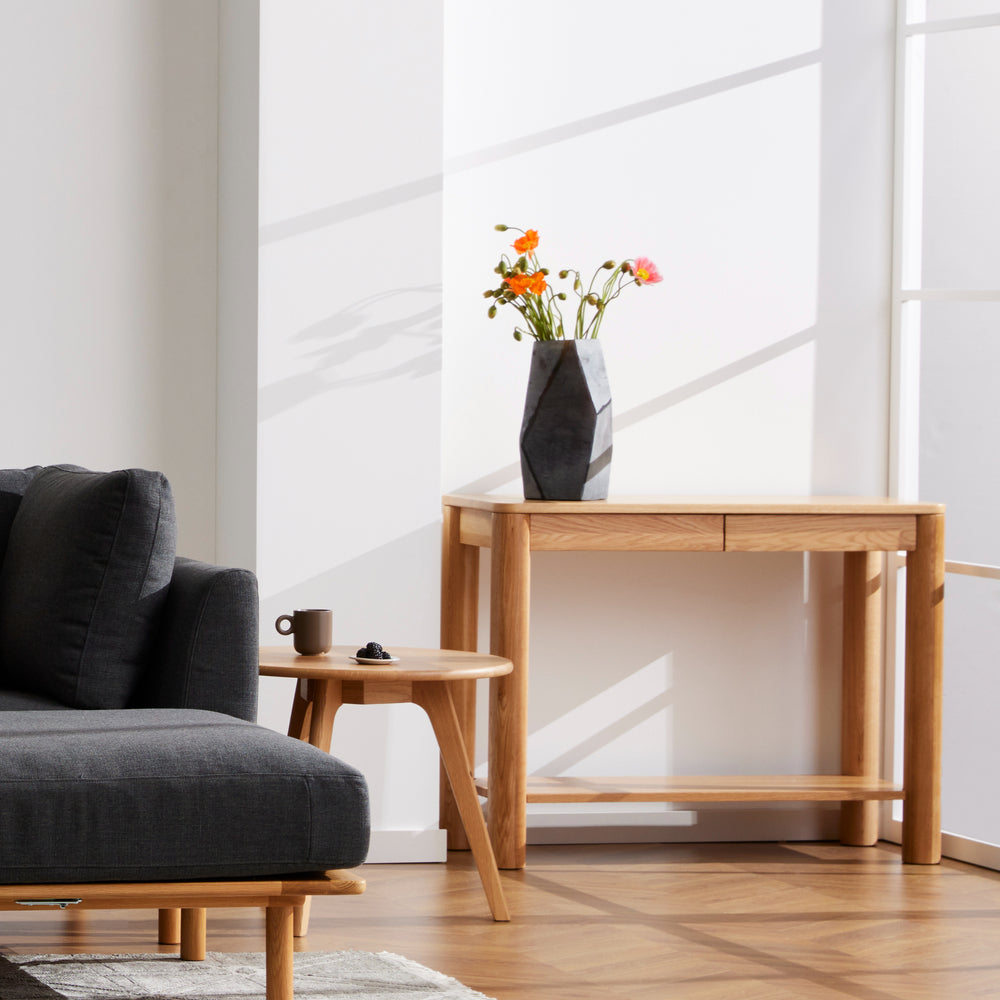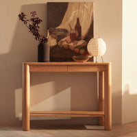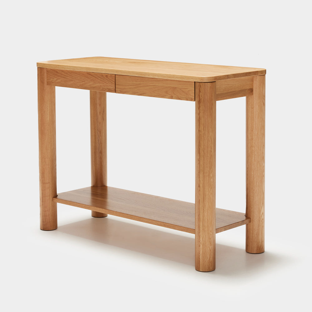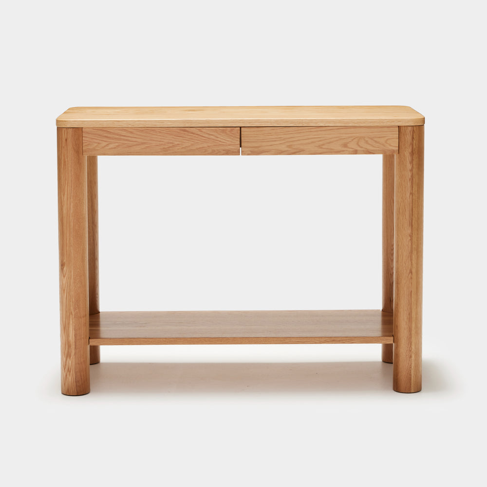 The Olivia console table in solid American oak balances clean lines with cylindrical legs and gently rounded corners. A slim drawer keeps keys and small essentials tidy, while a lower shelf adds practical display space. The 39 inch length suits hallways and living zones, and the durable finish makes daily care simple.