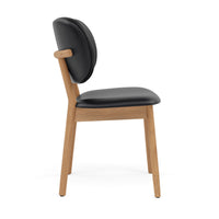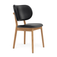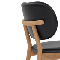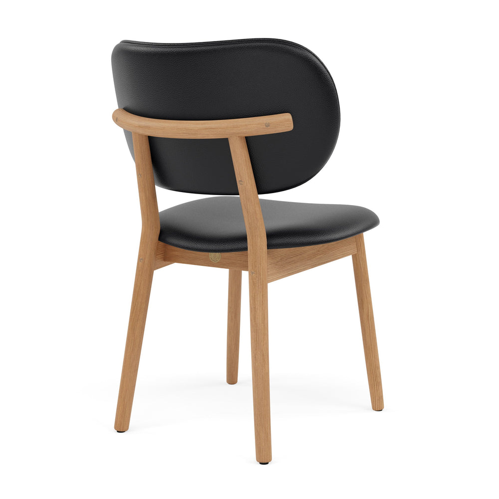 The Olivia Dining Chair is Scandinavian inspired and crafted from solid American oak, designed to bring beauty and comfort to your table. Its frame is carefully joined for long term stability, while a supportive seat upholstered in black leather encourages lingering conversations and relaxed meals. The leather is supple and designed to age beautifully with use. Subtle contours in the back and seat support natural posture so guests feel comfortable from first course to last. Hand finished surfaces celebrate the character of real wood and pair easily with modern or classic settings. The Olivia frame offers a graceful stance that feels welcoming from every angle. As an IconByDesign original, it reflects our commitment to enduring craftsmanship and design integrity that stands apart from imitations.