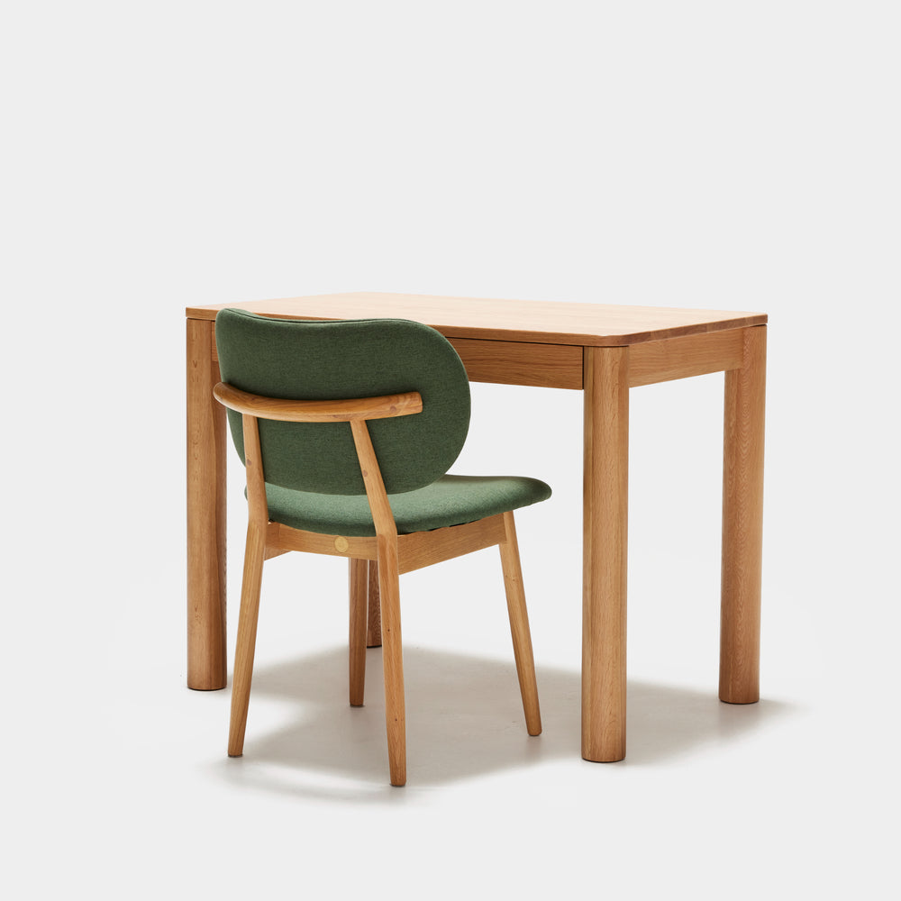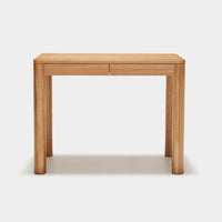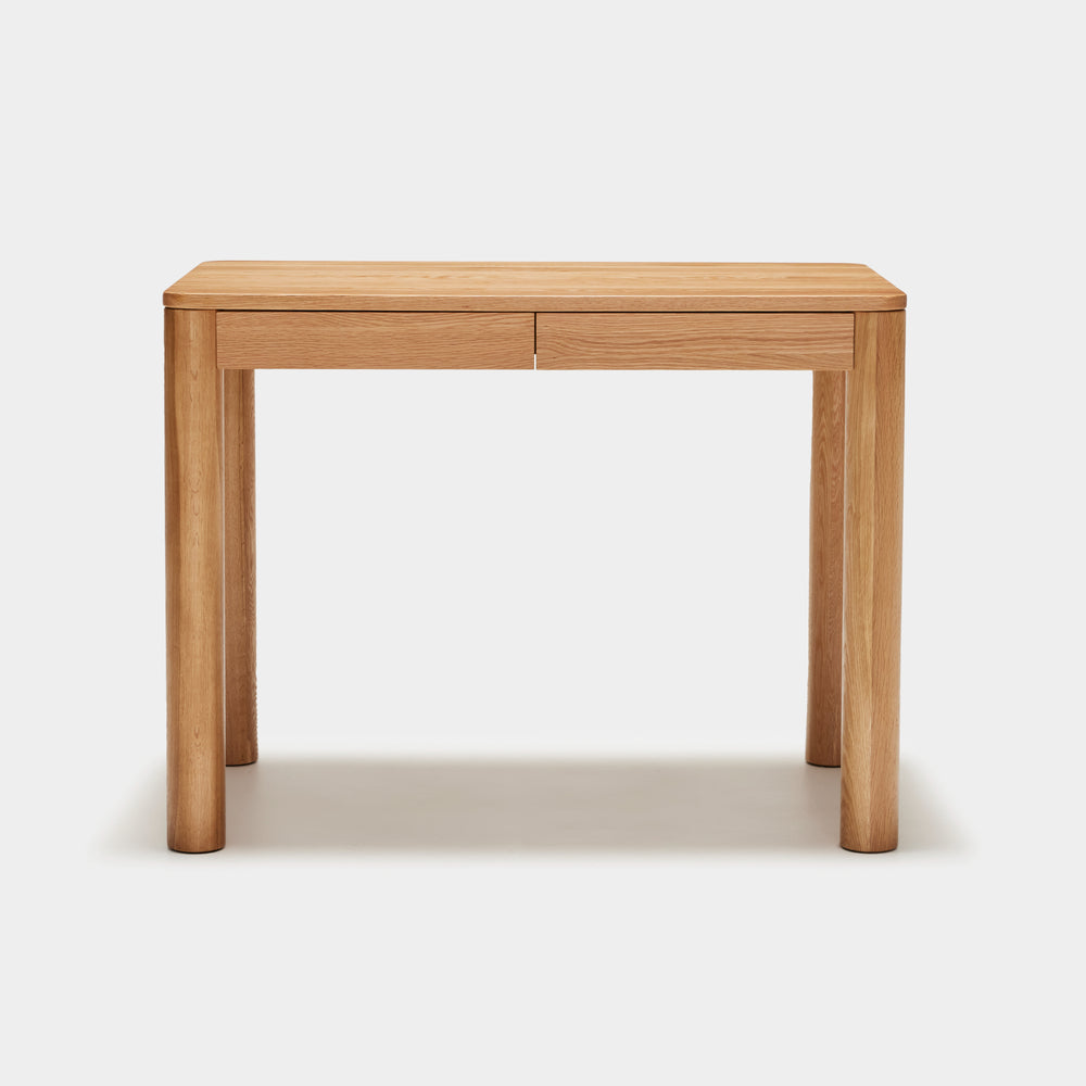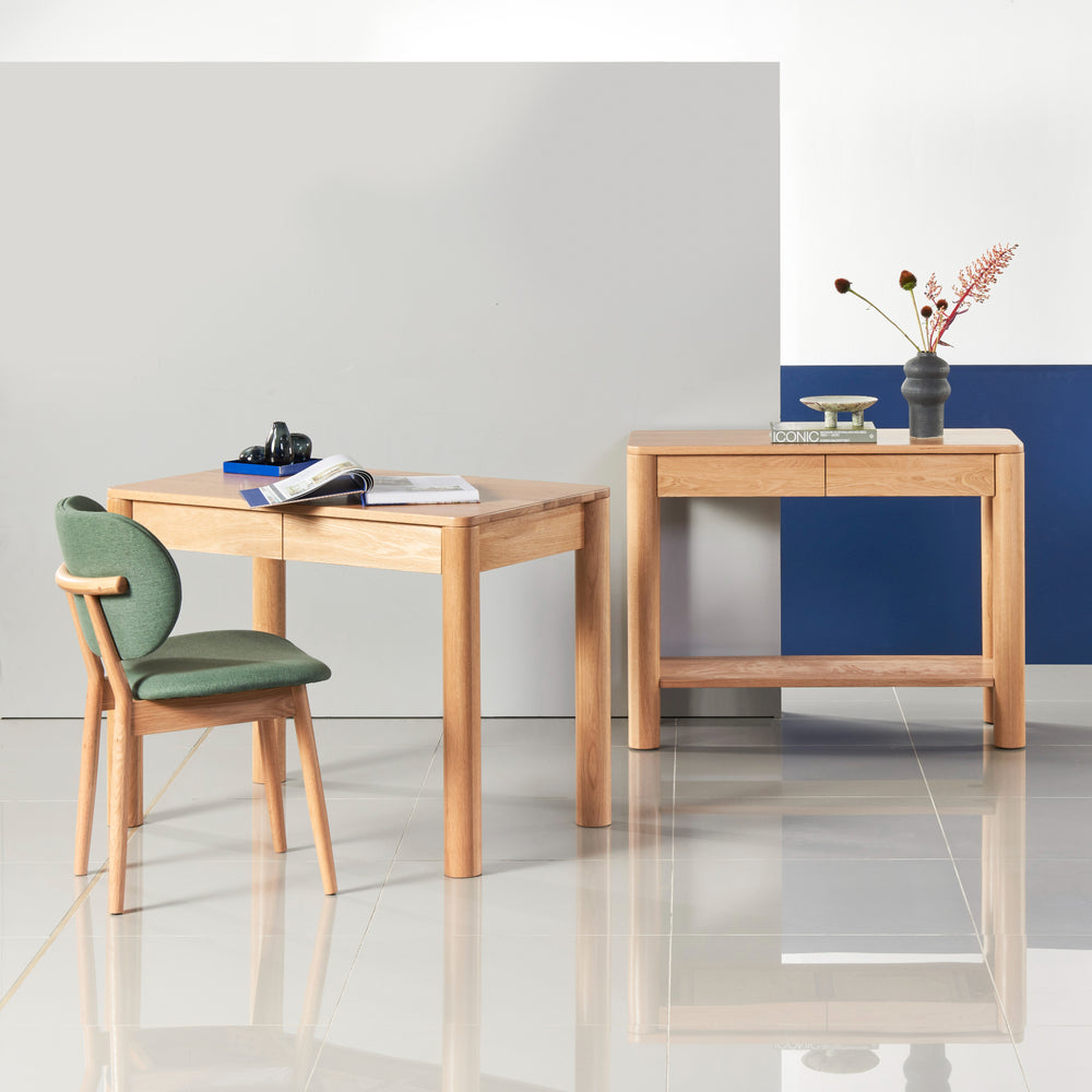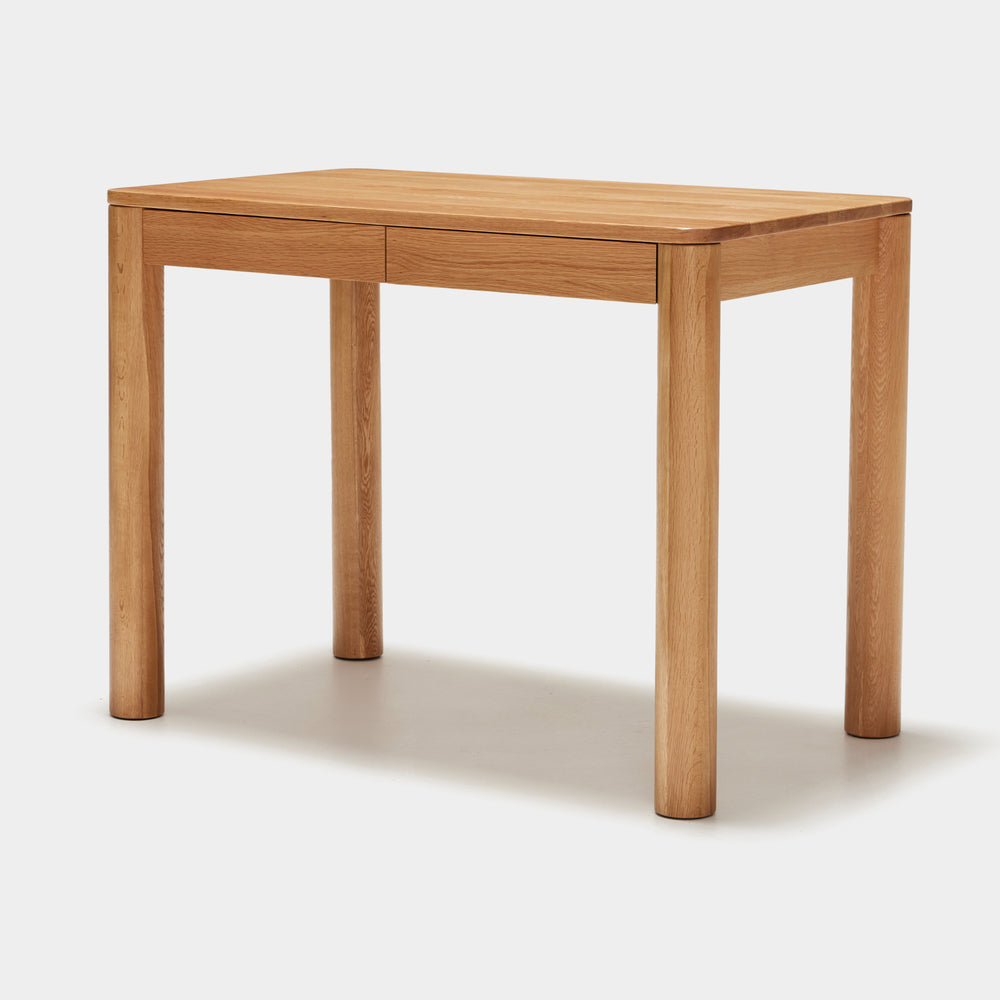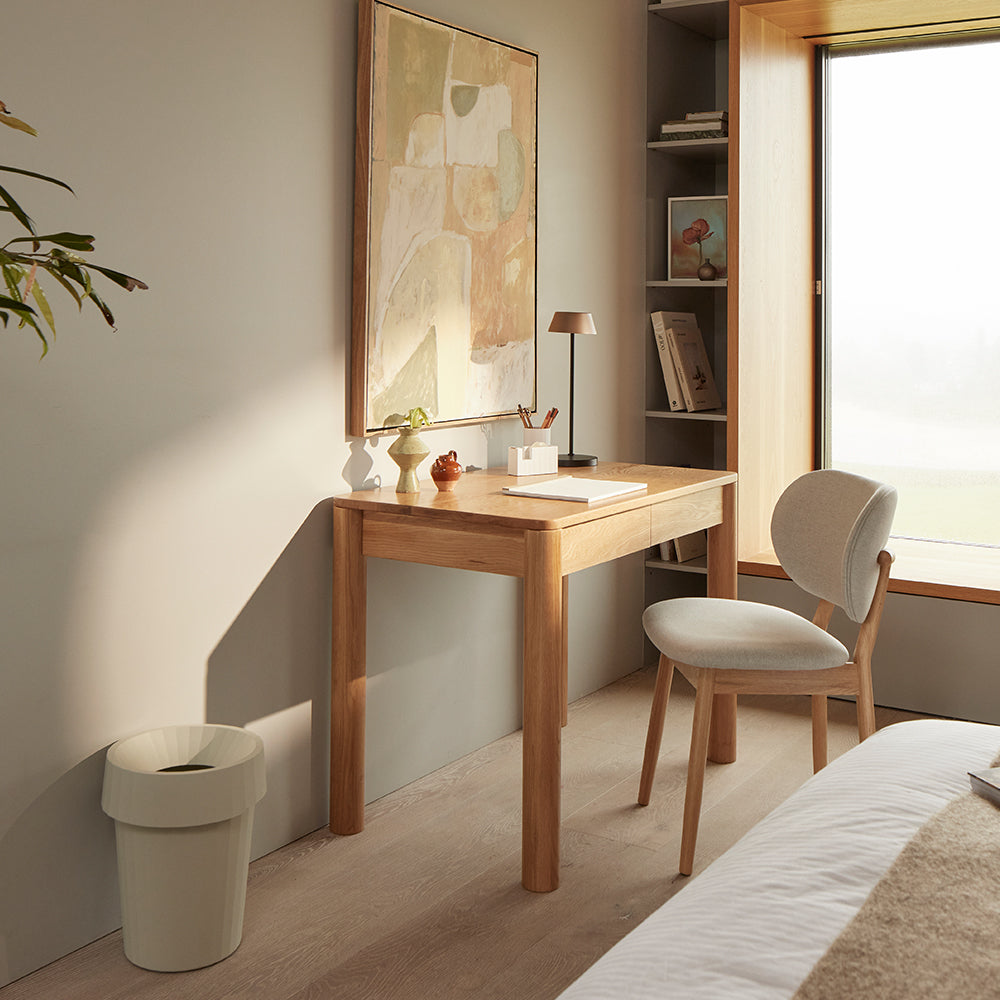 The Olivia desk in solid American oak showcases rounded corners, cylindrical legs, and thoughtfully sized drawers to minimize clutter. The 39 inch width fits compact study nooks and open plan spaces, while the smooth finish keeps maintenance easy. A modern minimalist profile that stays beautiful through daily use.