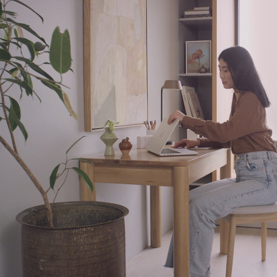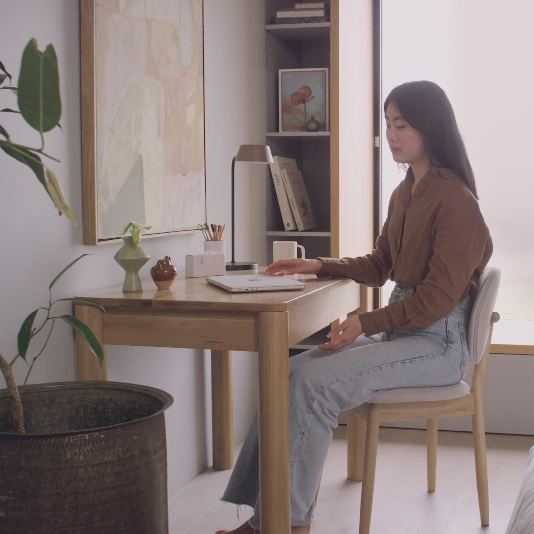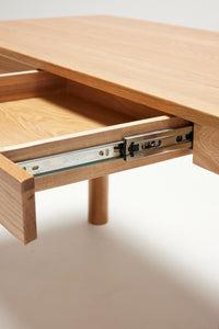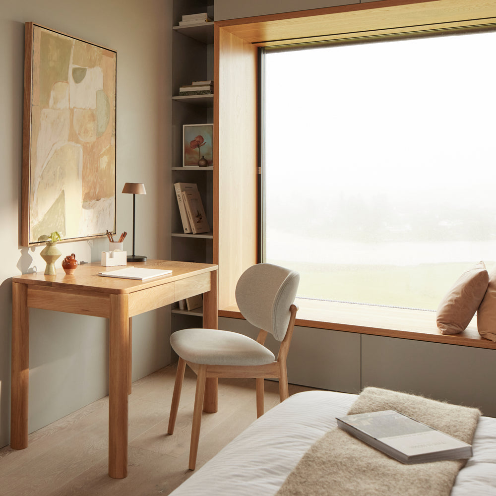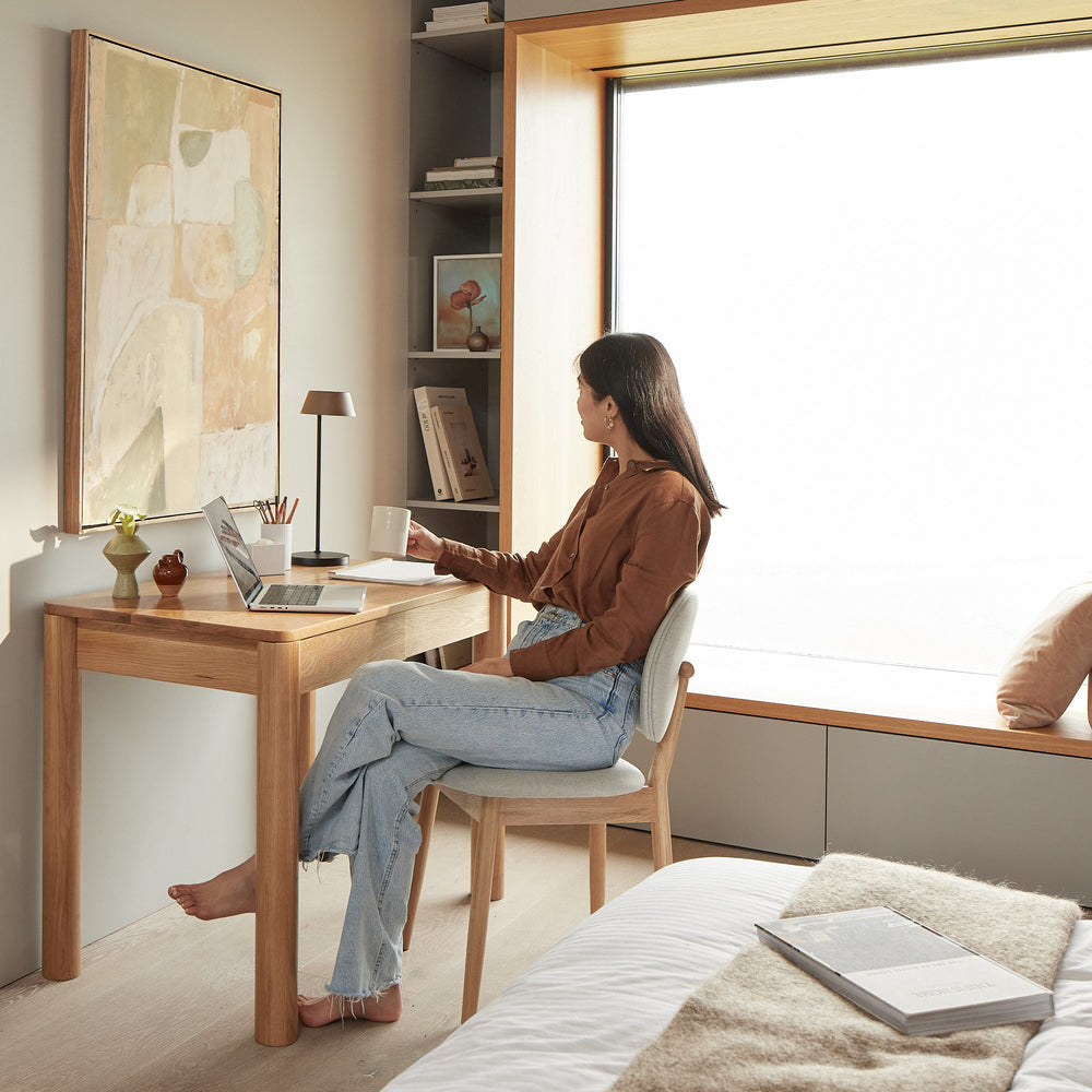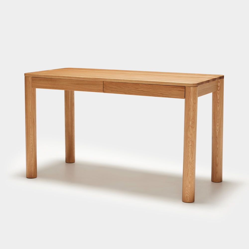 The Olivia desk in solid American oak showcases rounded corners, cylindrical legs, and thoughtfully sized drawers to minimize clutter. The 39 inch width fits compact study nooks and open plan spaces, while the smooth finish keeps maintenance easy. A modern minimalist profile that stays beautiful through daily use.